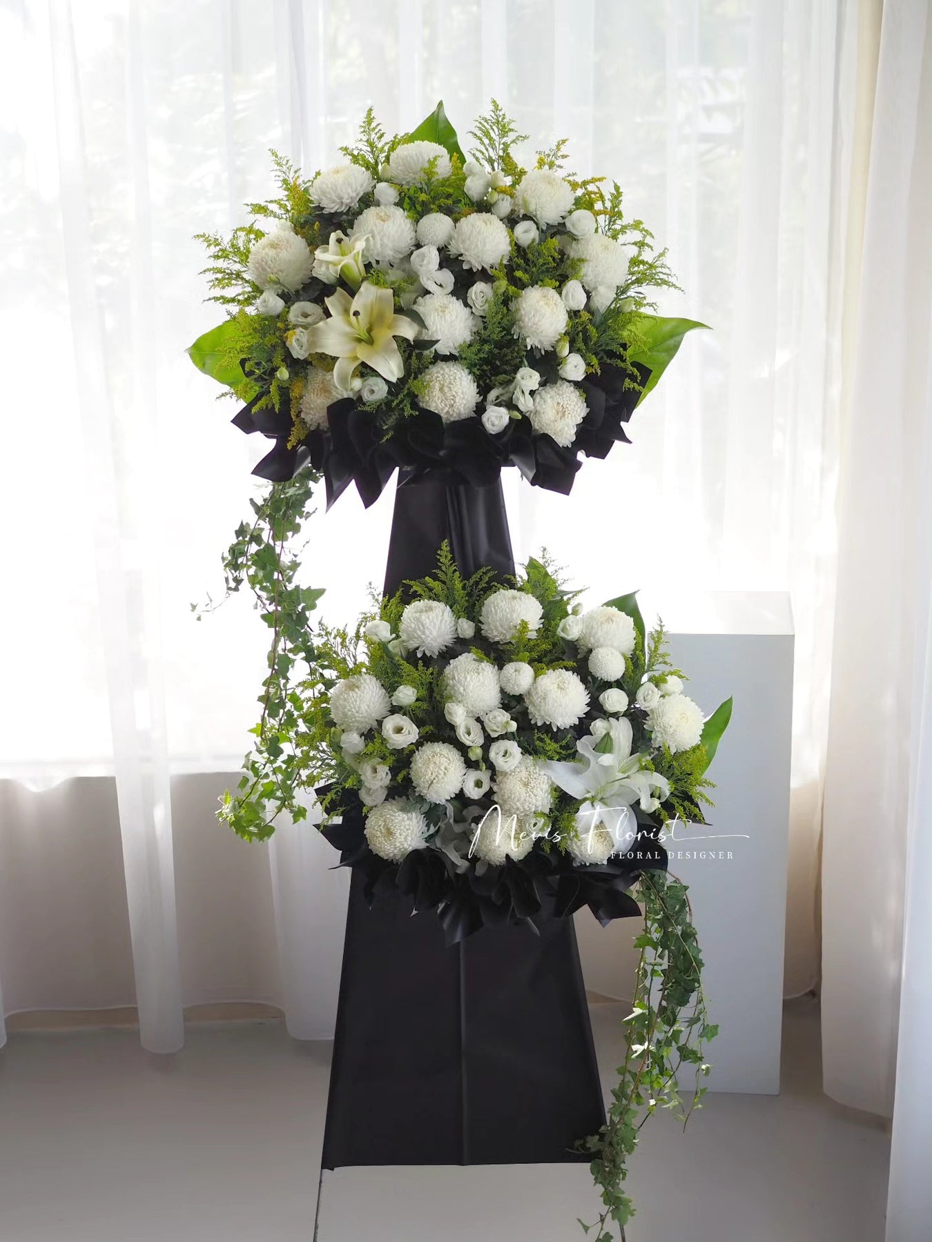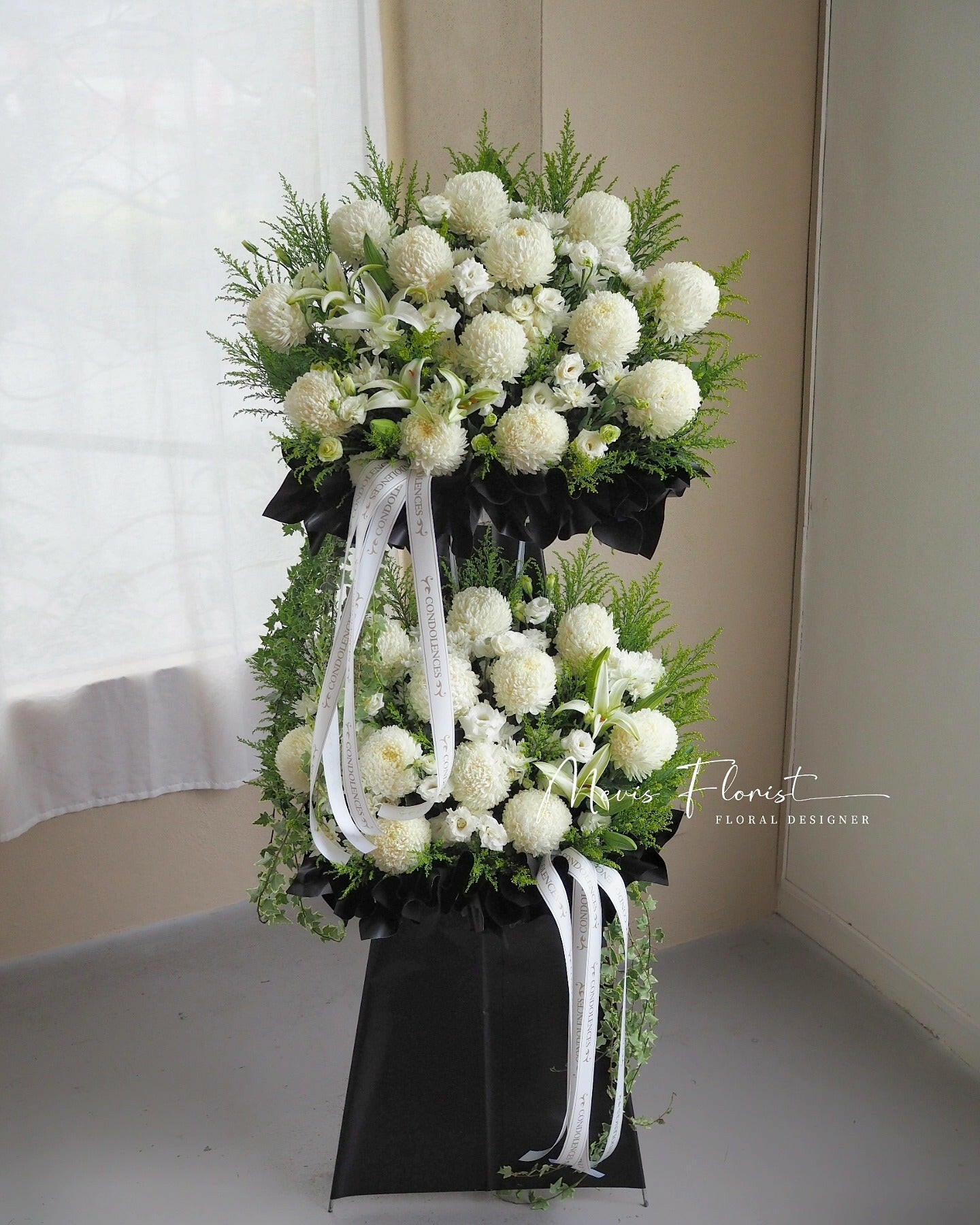 Rest In Peace ialah susunan yang menarik dan elegan, menampilkan bunga segar yang memberikan penghormatan yang selesa dan indah untuk majlis-majlis takziah. Biarkan kesederhanaan dan keindahan semula jadi bunga-bunga ini menawarkan ketenangan pada masa kehilangan.