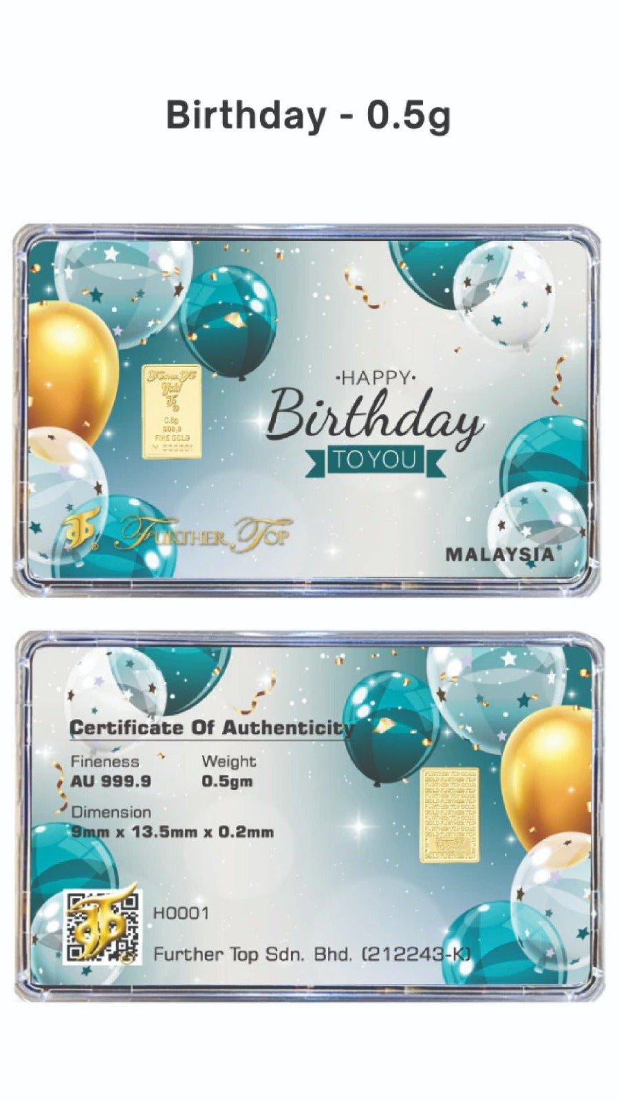 Make birthdays extra special with Cinta Gold’s Birthday-themed gold bars, available in a 0.5g option. Crafted from AU 999.9 pure gold and adorned with festive birthday designs, these gold bars are the perfect way to celebrate loved ones. Each bar includes a Certificate of Authenticity, assuring its purity and quality. Ideal for pairing with bouquets, flower boxes, or gift baskets, these gold bars add a luxurious and meaningful touch to any birthday surprise. With convenient delivery across Penang and surrounding areas, gifting a premium-quality present has never been easier. Proudly crafted in Malaysia, Cinta Gold brings you the finest in authentic gold gifts.