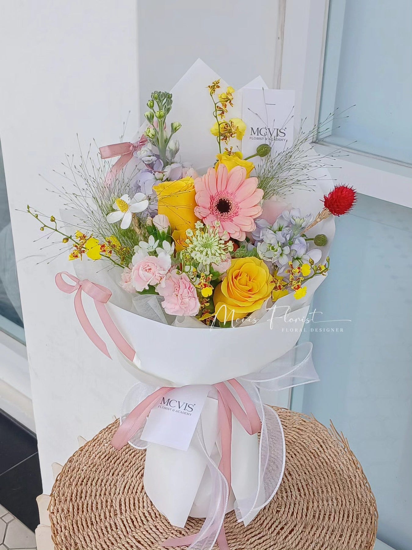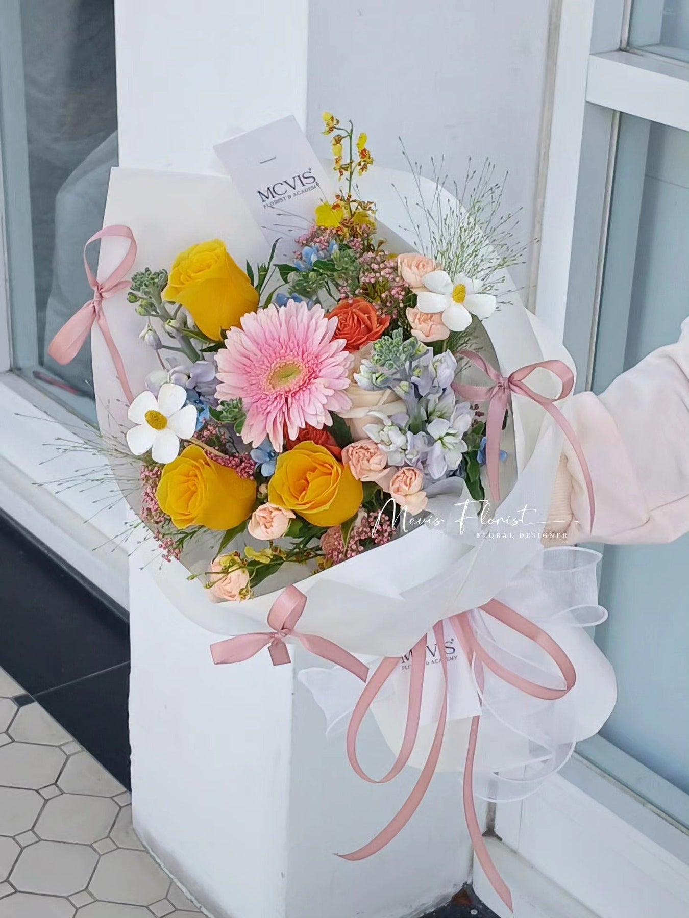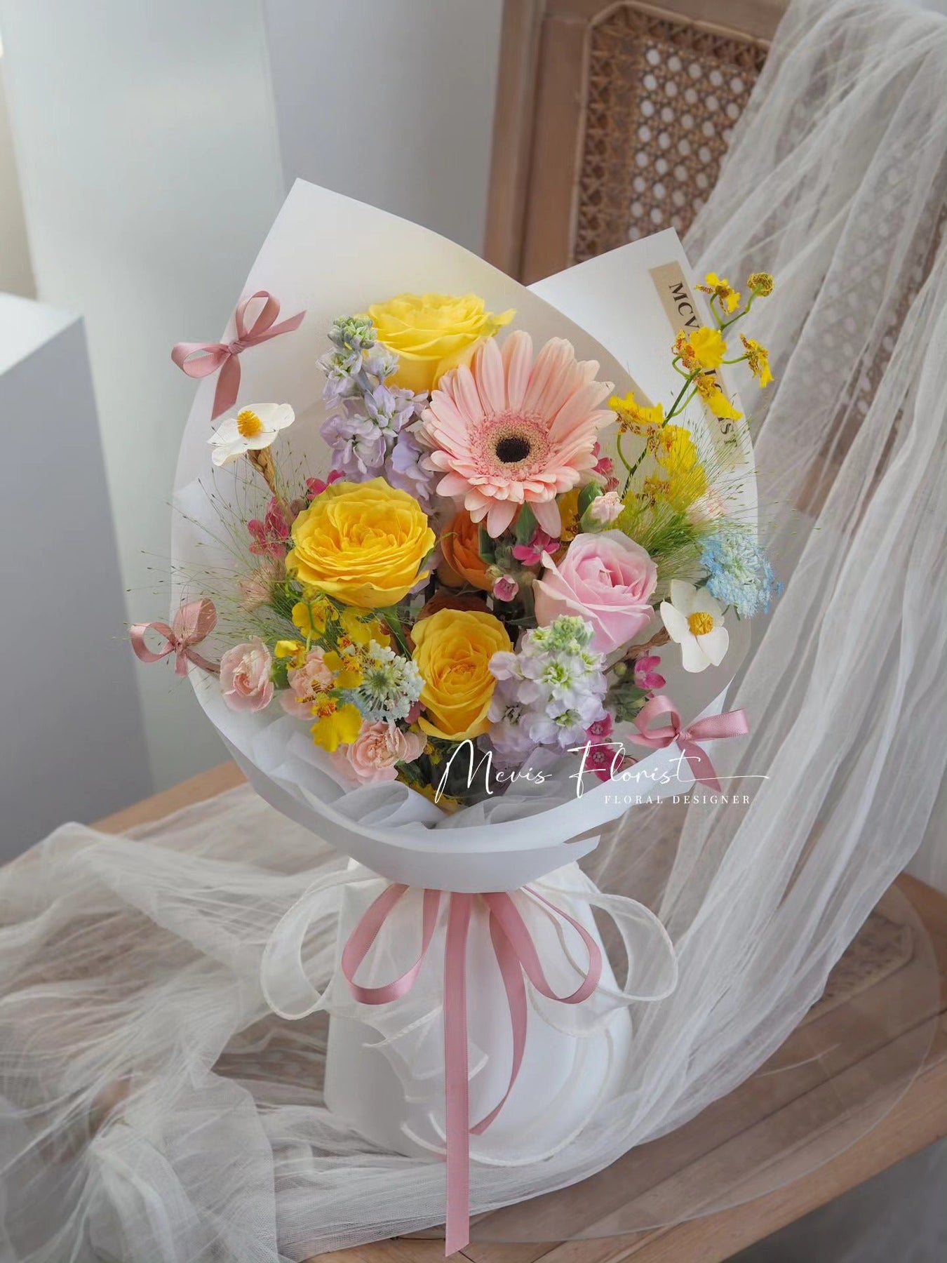A cheerful pastel bouquet featuring sunny yellow roses, a soft pink gerbera, blush roses, peach spray carnations, lilac stock, and delicate blooms in white, blue, and yellow. Wrapped in crisp white paper and finished with pink ribbons, it’s a fresh and elegant arrangement perfect for brightening any occasion.